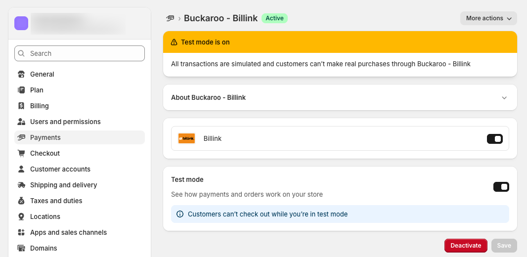 - You can enable the payment method with the toggle switch, the same for the test mode if you would like to test this method first.